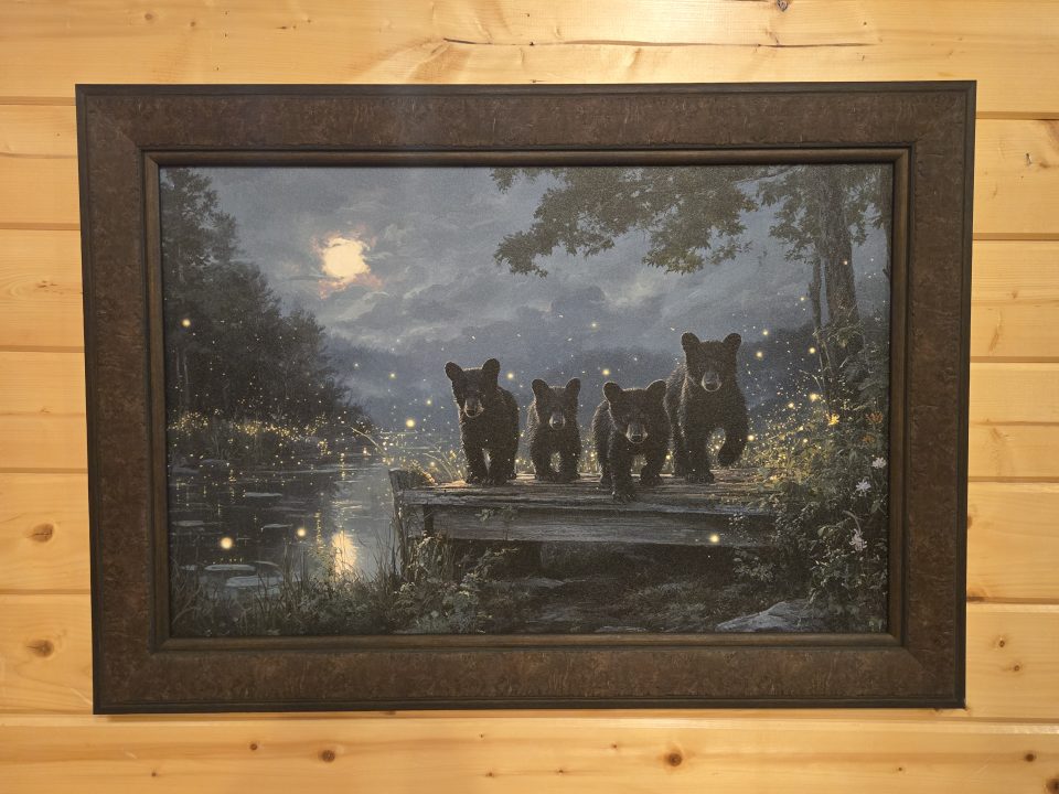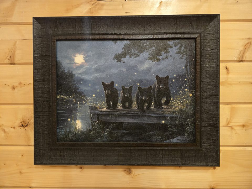 Available in two sizes: 34.5″ x 24.5″ and 20.5″ x 16.5″. Bear cubs on dock with fireflies.