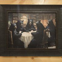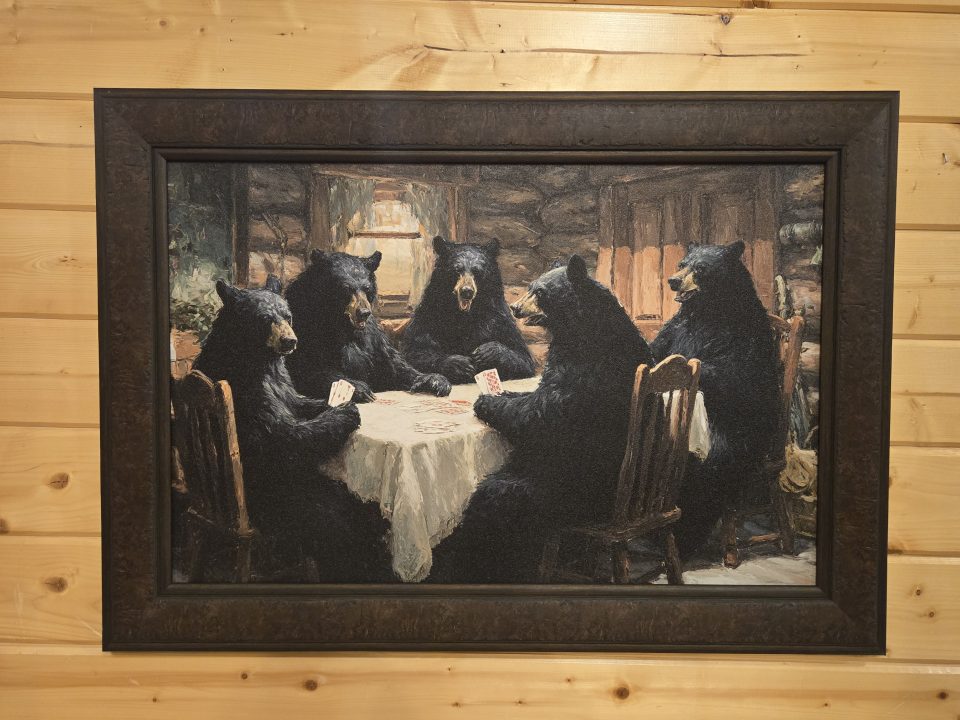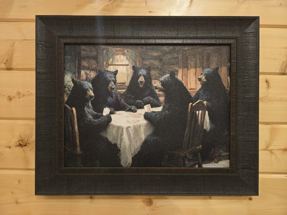 Available in two sizes: 34.5″ x 24.5″ and 20.5″ x 16.5″. Bears playing cards at a table.